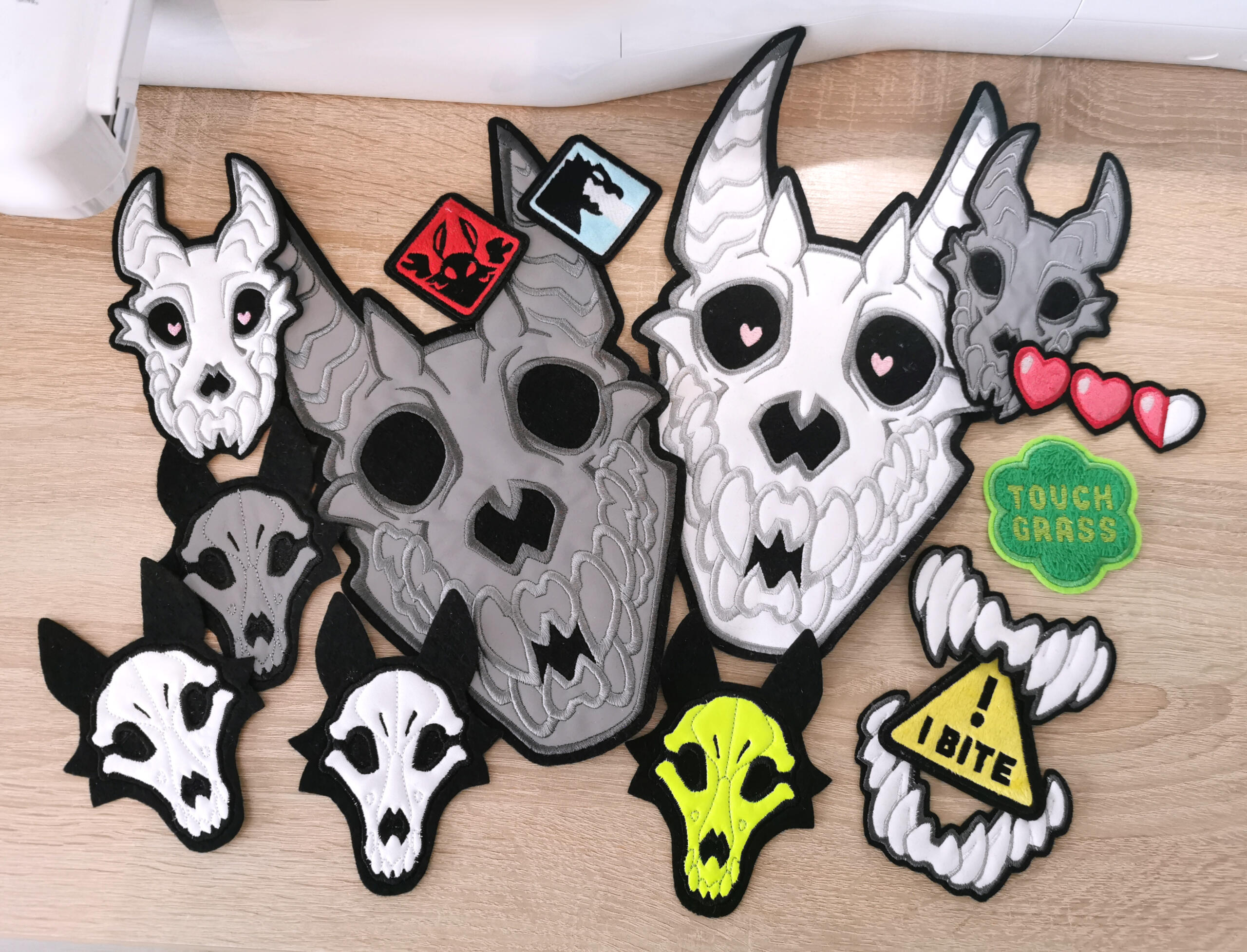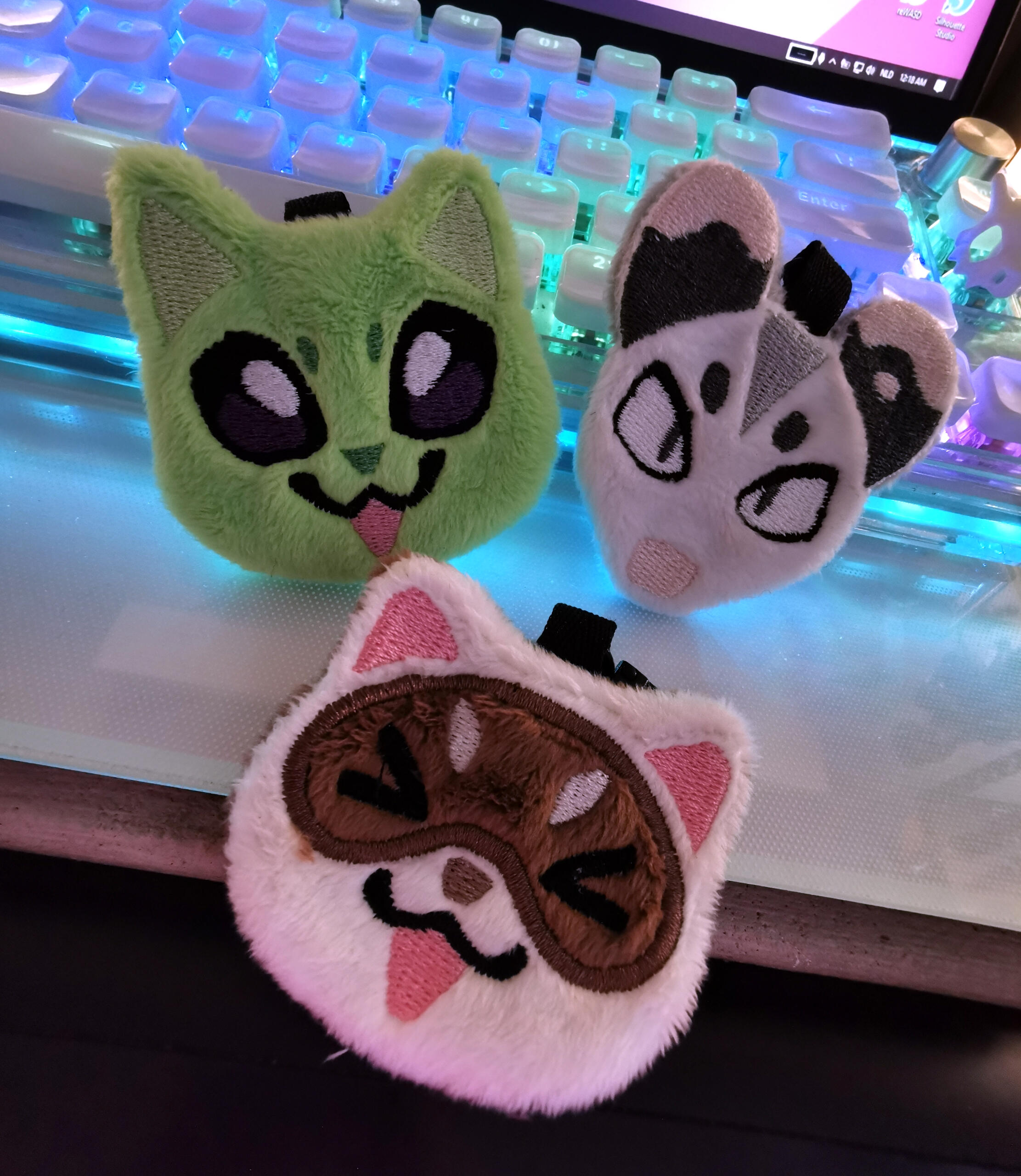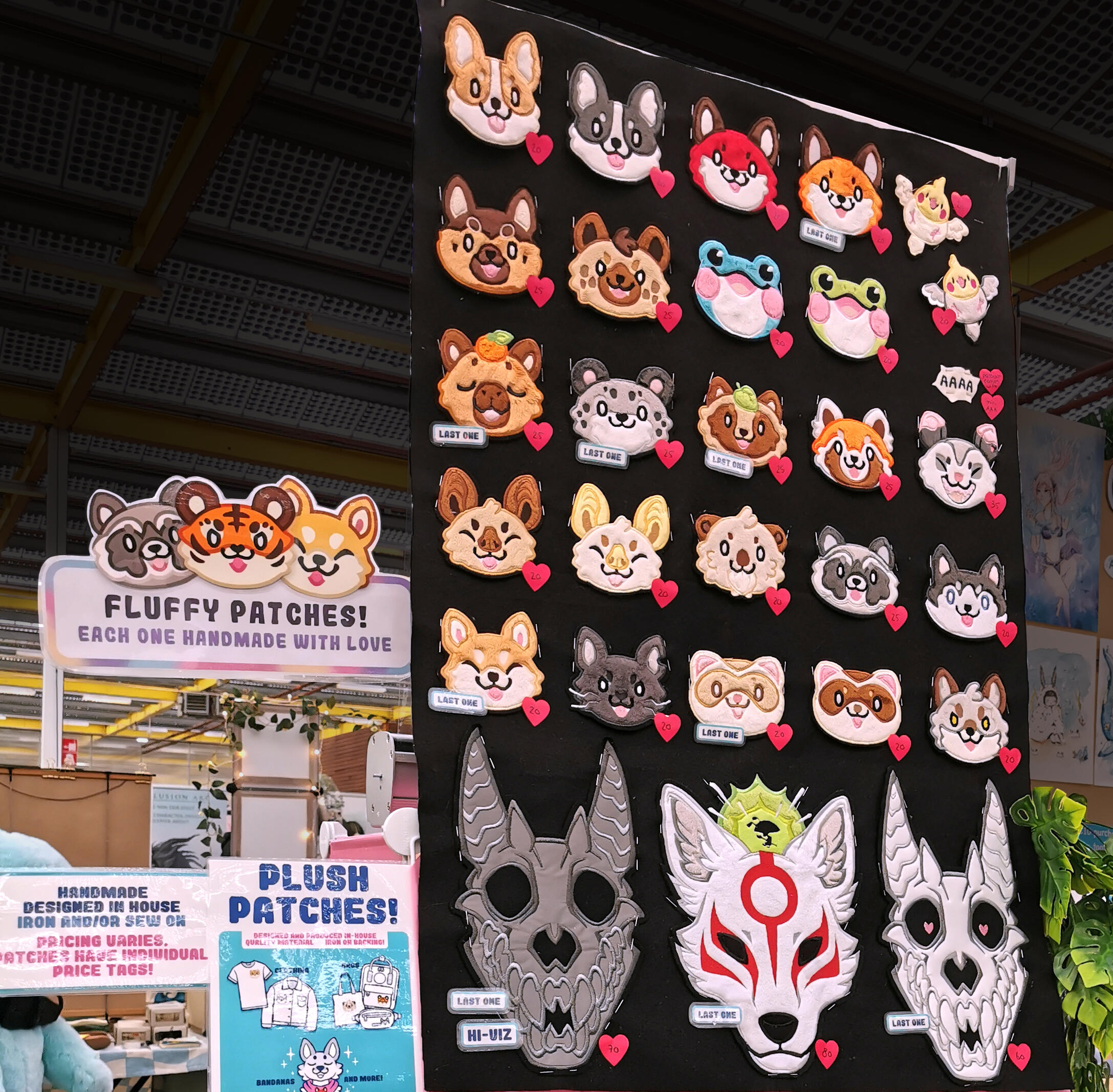 fluffy iron-on patches - plush keychains - acrylic keychains - stickers - lanyards - simple plush - at-con commissions - take home commissionsAll embroidered goods are designed & produced by Clear themself!