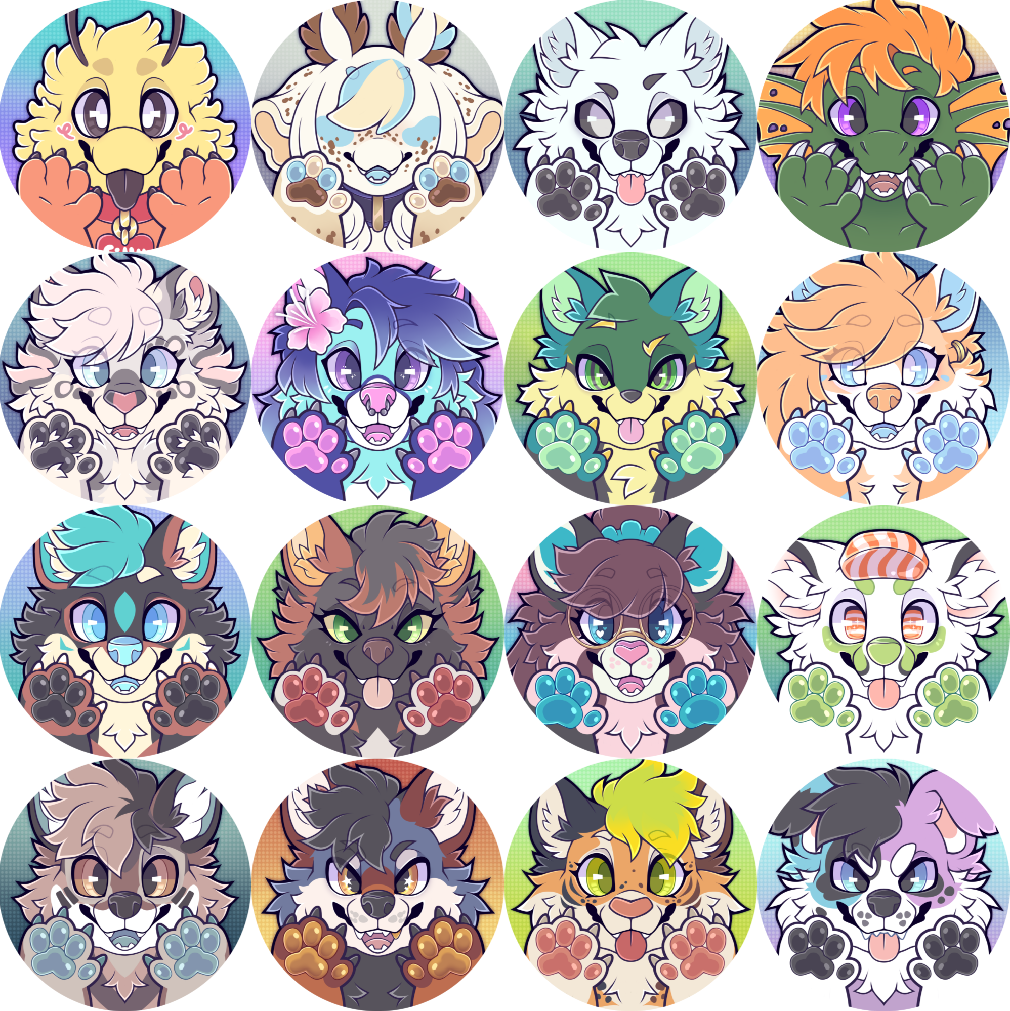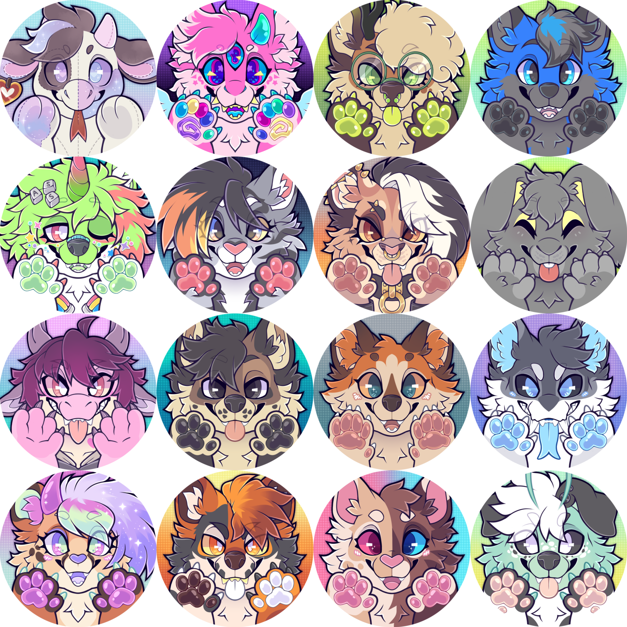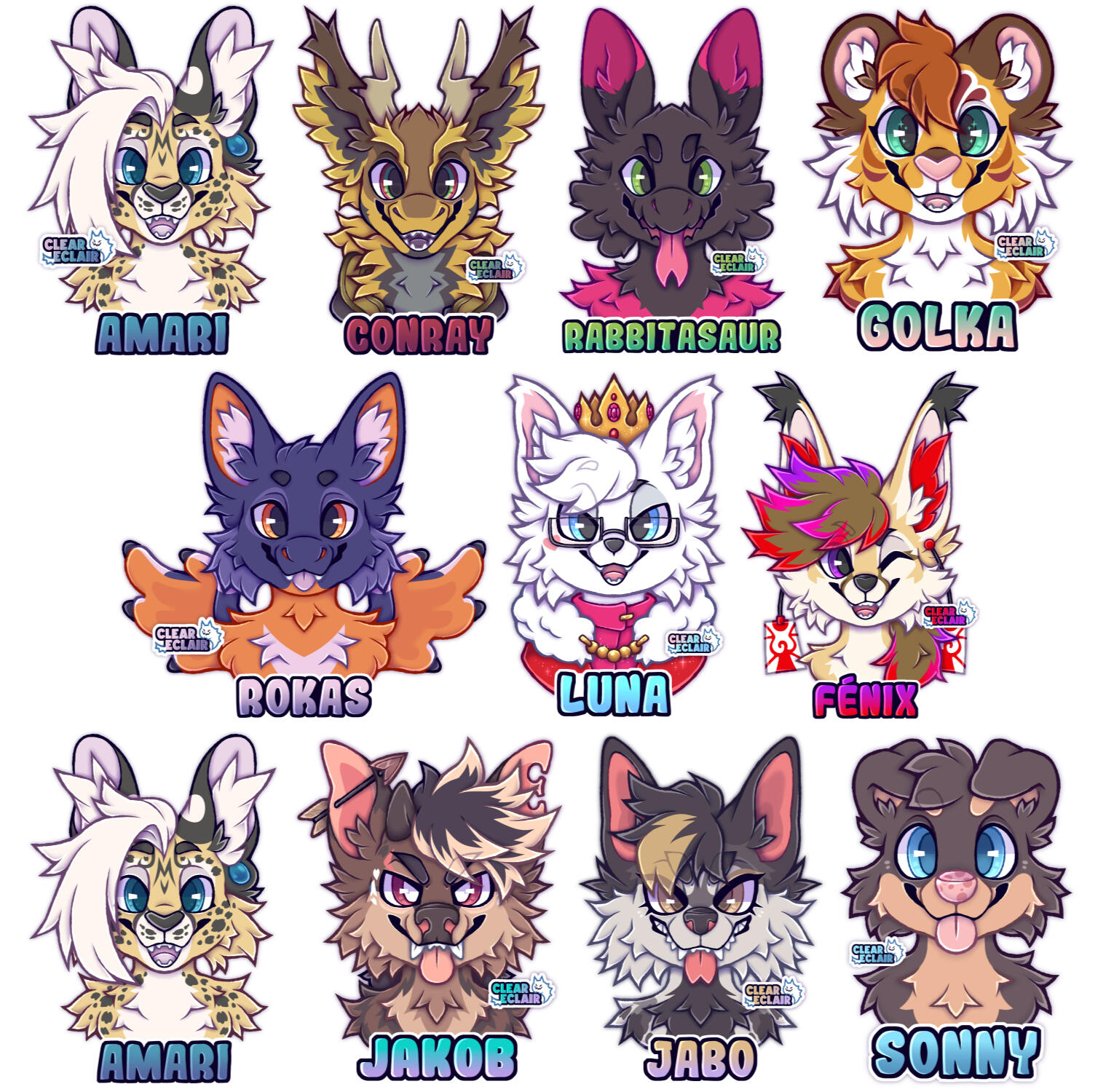 fluffy iron-on patches - plush keychains - acrylic keychains - stickers - lanyards - simple plush - at-con commissions - take home commissionsAll embroidered goods are designed & produced by Clear themself!